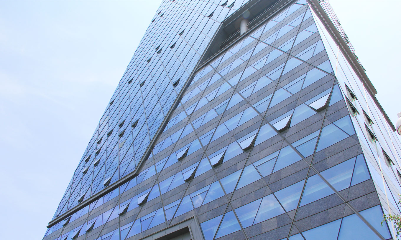 立面简洁,特殊的菱形幕墙形式,采用双银LOW -E 8+12A+8 钢化中空玻璃等现代建筑材质构筑而成,充满张力的直线条,独特的几何体立面,演绎建筑的刚柔并济,展现极具现代感的尊贵气质与非凡品质。